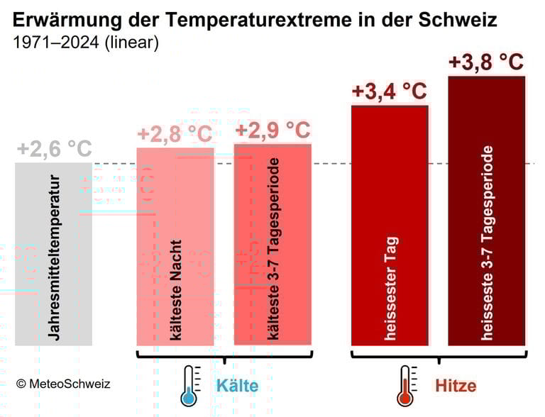 Temperatures in Switzerland are rising at an ever-increasing rate. Over the past 50 years, extreme temperatures, especially heat waves, have risen significantly more than the average temperature. This is shown by a recent analysis by MeteoSwiss. Mehr / Plus