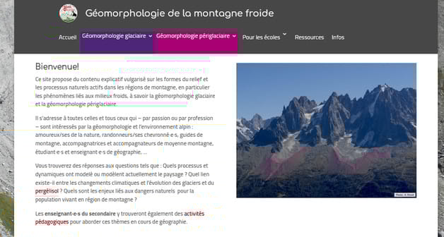 | | La Société Suisse de Géomophologie a un nouveau site. Il s'adresse principalement aux écoles secondaires. Toutefois, le contenu convient également aux guides de randonnée et de montagne mais aussi à tous ceux qui s'intéressent aux Alpes. Il propose des textes, photos et illustrations expliquant les principaux processus naturels actifs